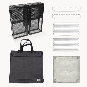 The AroundFire Gather Lite Set(4-6 Seater) is incredibly lightweight at just 16 lbs (7.4 kg, including Grill Table + Fire Mesh + Grill Grates + Cook Stands + Travel Bag), while our AroundFire Gather Grande Set(8-10 Seater) weights only 20 lbs! Unlike traditional portable stoves that can weigh over 10 kg, its innovative double-folding design makes it the ideal portable companion for cooking and relaxing with friends wherever your adventures take you.